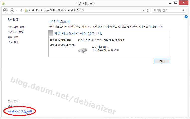 2. [제어판 > 모든 제어판 항목 > 파일 히스토리] 창에서 왼쪽 하단의 'Windows 파일 복구' 링크를 누른다.