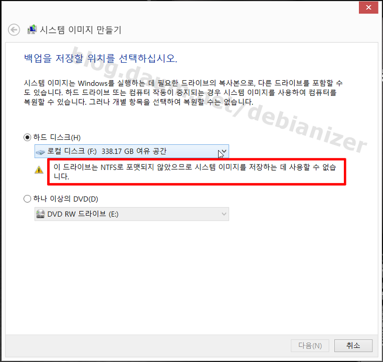 4. [시스템 이미지 만들기] 창에서 백업 이미지를 보관할 파티션 (또는 드라이브)를 선택한다.