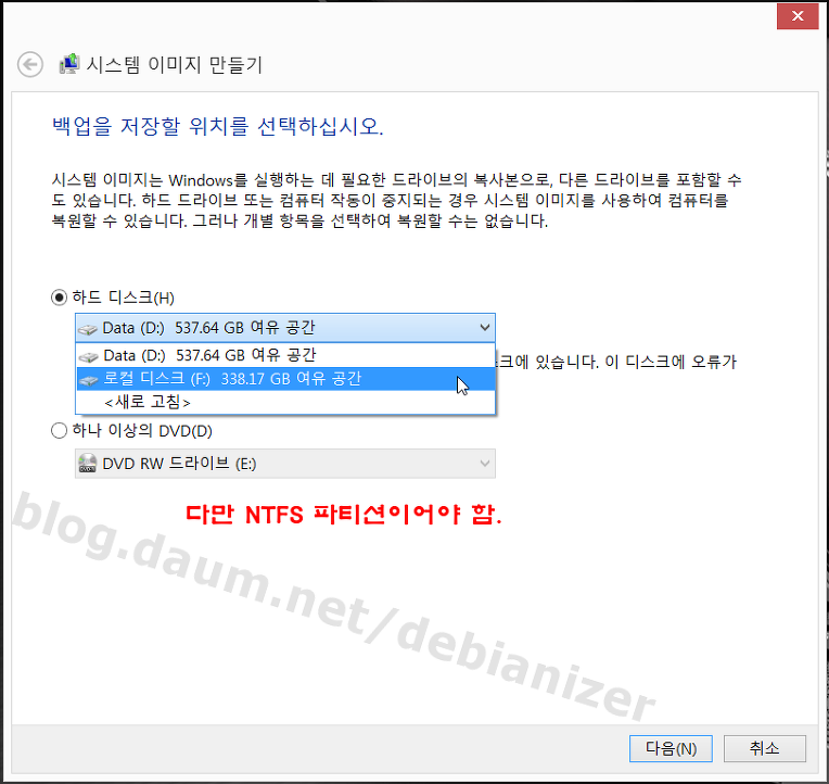 (OS 가 설치된 C: 는 기본적으로 선택목록에서 빠져 있다. 될 수 있는 한, OS 설치파티션이 속하지 않은 드라이브를 선택할 것을 권한다.