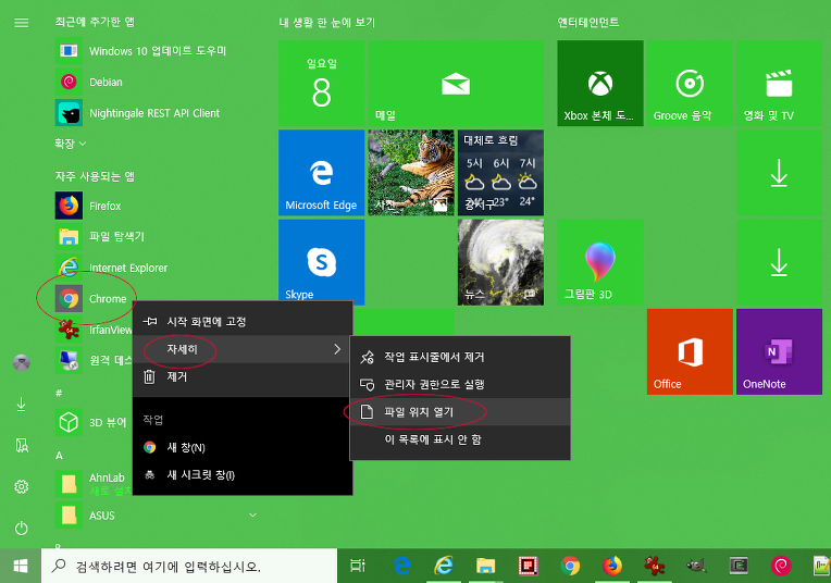 바로 가기(또는 옛이름, '단축 아이콘') 를 얻는 방법에는 여러가지가 있지만, 윈도 10 에서 시작메뉴로 프로그램을 찾은 다음 마우스 우클릭으로 [자세히] - [파일 위치 열기] 를 통해 탐색기로 따라가는 방법이 있다.