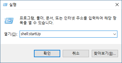 <윈도버튼><R> 키 조합으로, 흔히 CMD.EXE 를 호출할 때 쓰는, '(명령) 실행창'을 열어서 'shell:startUp' 를 입력하고 엔터를 눌러보자.