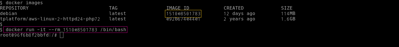 docker run -it --rm $(이미지 아이디) /bin/bash