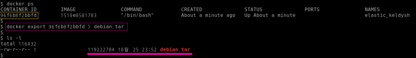 docker export $(컨테이너 아이디) > $(저장할 파일명) 으로 내보내기를 완료한다.
