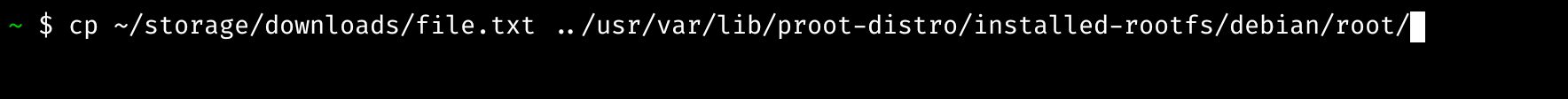 문제는 proot-distro login debian 으로 termux 안의 뉴 debian 으로 로그인하게 되면 위에서 언급한 storage 링크를 쓸 수 없다. 왜냐하면 fakeroot 유틸리티와 비슷한 proot 에 의해 외부가 차단되기 때문이다. 따라서 proot 로 로그인하기 전의 termux 상태에서 내부 배포판의 rootfs 로 파일을 복사해주어야 한다.
