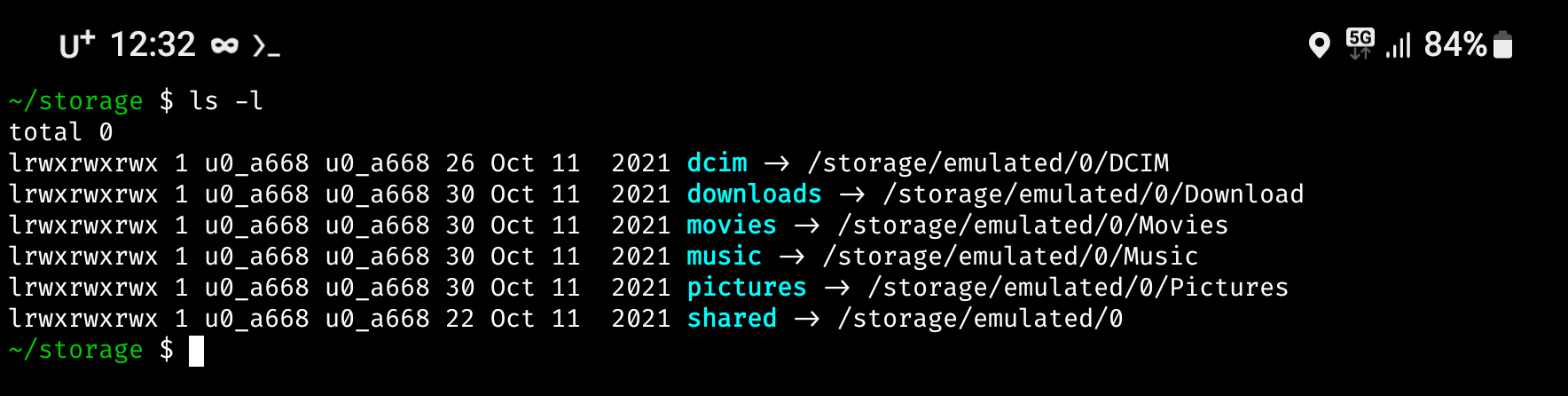 의외로 termux 에서 제공하는 관리 유틸리티가 많은데 이 중에서 termux-setup-storage 를 실행하면 홈디렉토리에 storage 아래의 디렉토리에 대한 링크를 생성해준다.