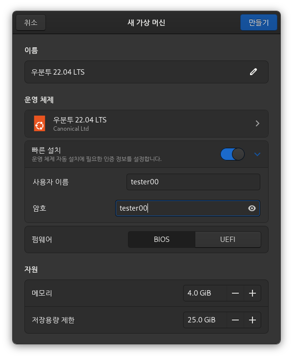 부트로더 설정에 관해 굳이 집어내자면, 운영체계 선택 단계 다음인 가상머신 생성 창의 펌웨어 영역에서 BIOS 와 UEFI 중에서 선택할 수 있다. 전자이면 으례 MBR 에 설치하는 과거 방식이고 후자면 EFI 파티션을 생성해서 거기에 부팅정보를 밀어 넣는 방식이겠지.