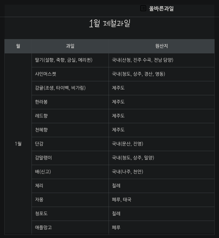 본 게시글에서는 학습을 목적으로 쿼리 작성에 필요한 데이터를 만들기 위해서 올바른 과일 페이지를 참조하였음을 명시합니다. 참고한 사이트 및 페이지 : 올바른 과일 / 시기별 계절별 원산지 제철과일 총정리 (feat. 올바른과일)