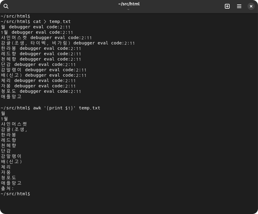유용한 텍스트 편집기를 활용해서 첫 번째 열의 텍스트를 추출한다. 여기서는 본 어게인 쉘에서 cat, awk 유틸리티를 활용한다.