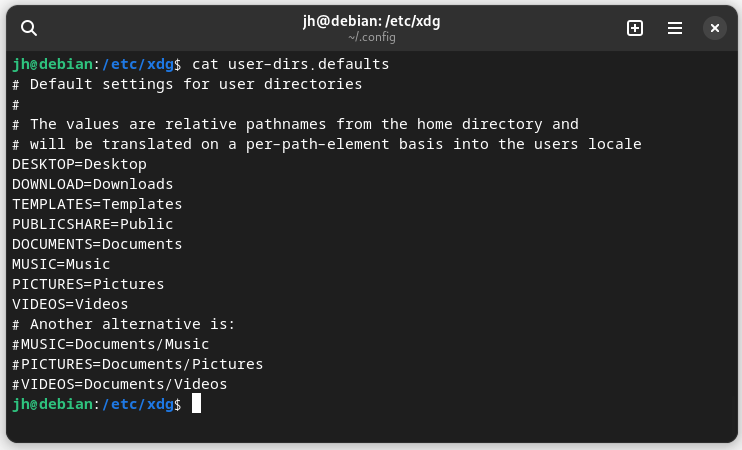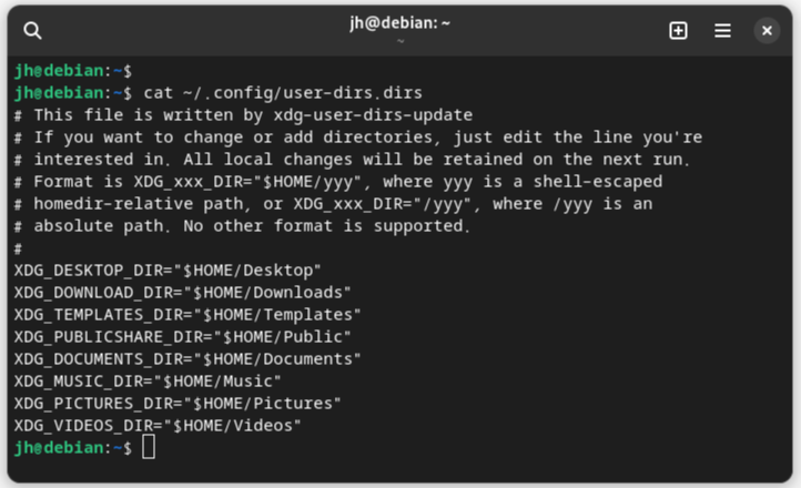 ~/.config/user-dirs.dirs 는 이렇게 생겼다. 데비안을 LANG=C 로케일로 설치 후 그놈 데스크탑 첫 로그인 시에는 아래와 같이 Desktop, Downloads, Templates, Public, Documents, Music, Pictures, Vieos 등으로 디렉토리가 생성되는데 한국인용 로케일로 변경한 후에 재로그인 시에 해당 디렉토리명이 한글명으로 변경되는 경우가 있다. 이른바, 바탕화면, 다운로드, 템플릿, 공용?, 문서, 음악, 사진, 비디오 등으로 나타나는데 리눅스를 쓰다보면 시스템 관리 목적으로 터미널이 아닌 getty 자체의 콘솔화면에서는 한글이 깨져서 나타나기 때문에 기본 디렉토리는 영문으로 표기되는 게 낫다.