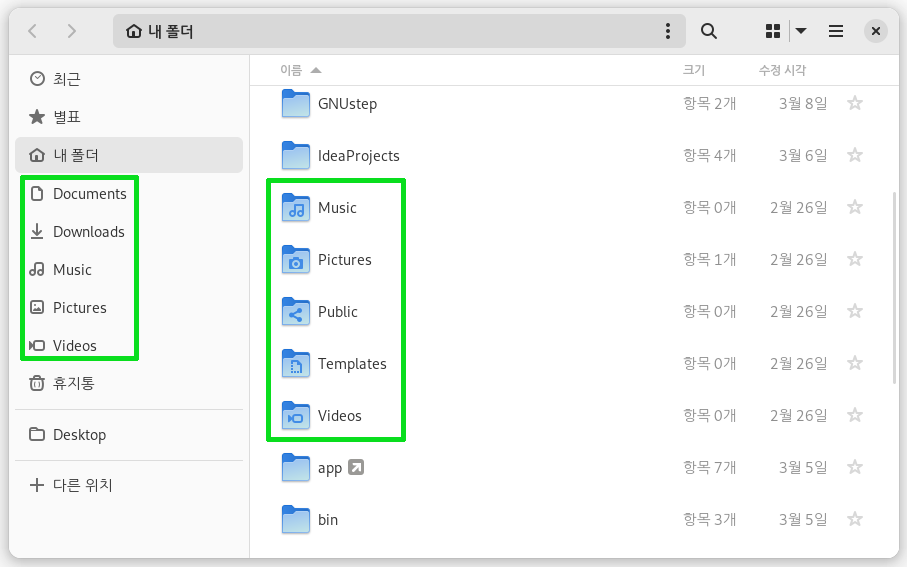 user-dirs 는 로그인 계정의 홈 디렉토리에서 내 문서, 내 비디오 같은 디렉토리를 의미한다.