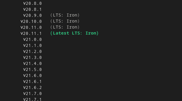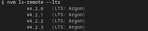 LTS 버전 목록을 조회하려면 뒤에 '--lts' 를 추가하면 된다.