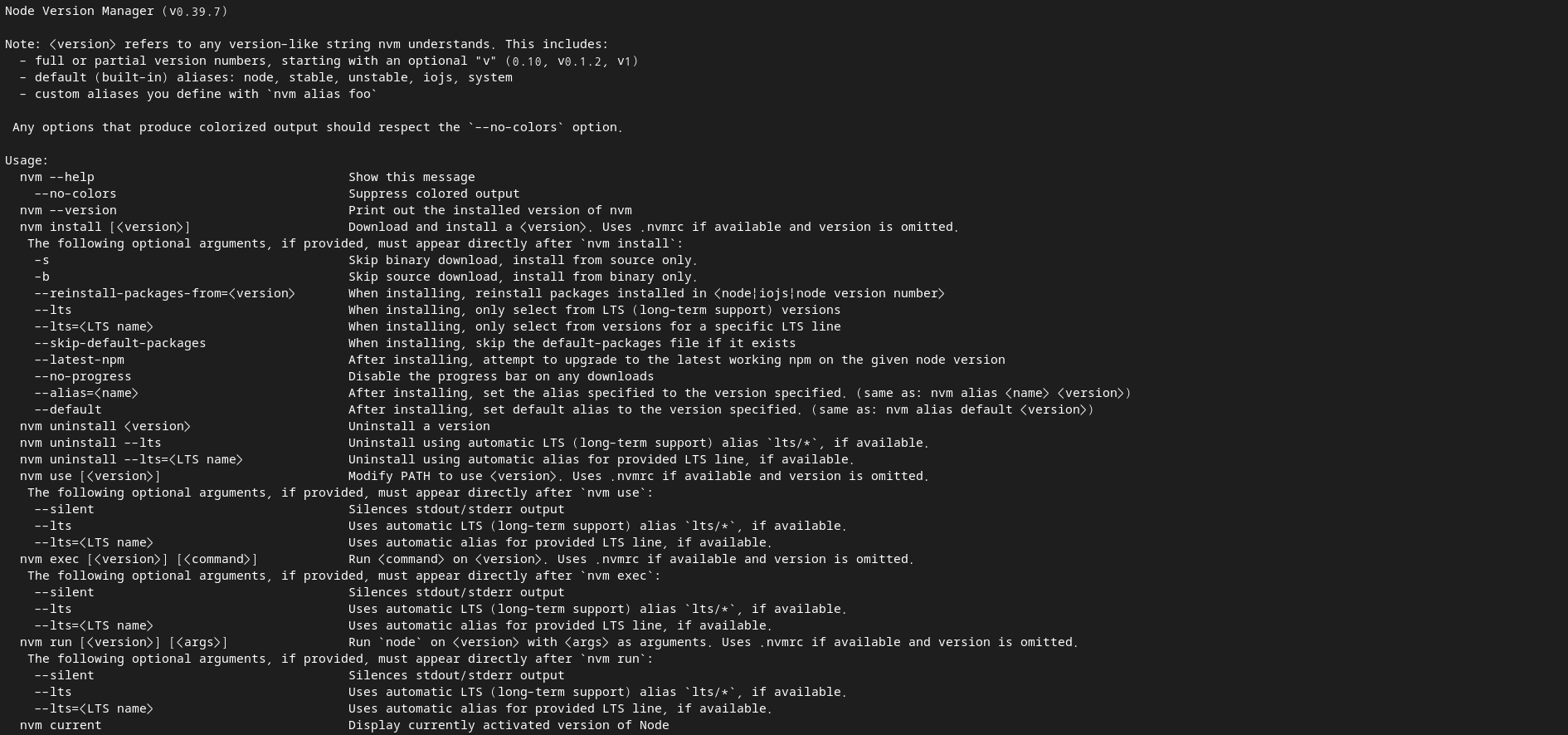nvm 을 실행하면 사용법이 모니터 화면을 가득 채운다. 학습을 위해 사용법이 궁금할 때 차근차근 보면 될 것 같다.