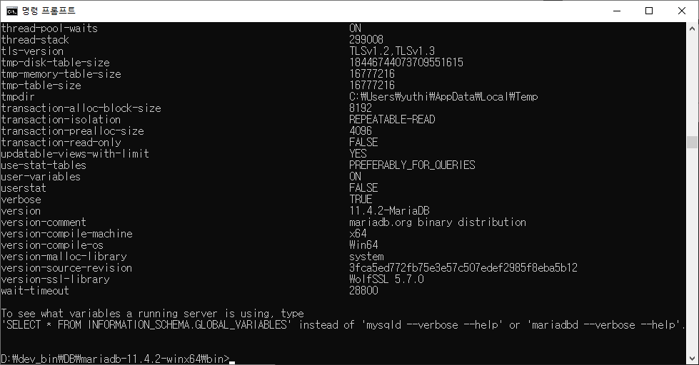mariadbd --help 만으로는 원하는 도움말을 얻을 수 없어서 '--verbose --help' 를 달아서 실행했더니 결과가 창을 넘겨서 다 볼 수가 없다.