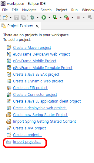 2) File > import 또는 Package Explorer > Import projects 를 클릭한다.