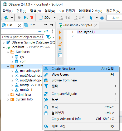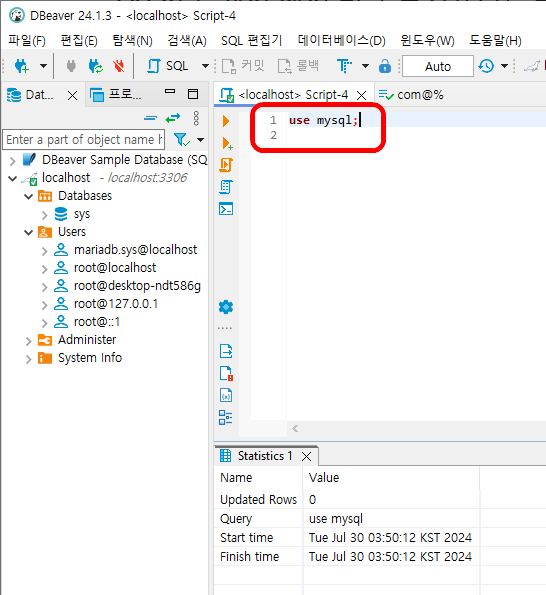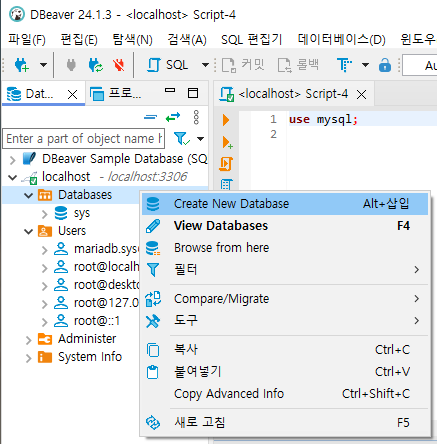 윈도 커맨드 창에서 mariadb 클라이언트 명령으로 Maria DB 에 root 계정으로 접속할 땐 mysql (DB명) 이 보이는데 DBeaver GUI 에서는 안보인다. 따라서 root 로 로그인한 후에 SQL 편집기에서