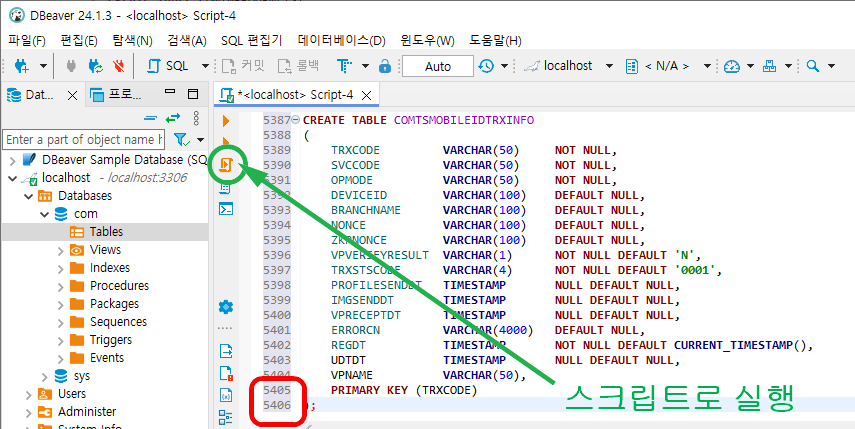 SQL 이 5406행 이라 너무 많기 때문에 커맨드 창에서 붙여넣기로 실행하거나 DBeaver 에서 <Ctrl><Enter> 키 조합으로 한줄씩 실행하면 이전 쿼리 실행결과를 받아오는 시각과 그것보다 먼저 실행되는 다음 쿼리 때문에 밀림현상이 일어나서 오류가 발생한다. 따라서 DBeaver 의 경우 스크립트로 실행하면 중간에 오류를 발생시키지 않고 말끔히 처리한다.