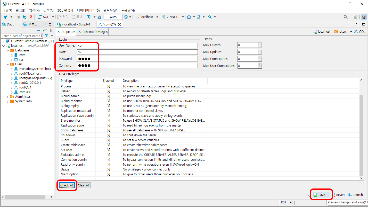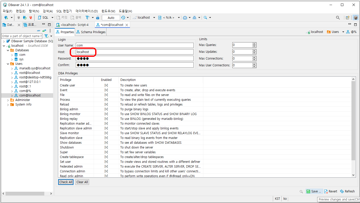 다만, globals.properties 에서 UserName 변수값에 기본 지정된 'com' 계정과 Globals.maria.Url 맨뒤에 붙은 'com' (데이터베이스명)은 script 쿼리에 안들어 있기 때문에 직접 생성하고 권한을 부여해야 한다.