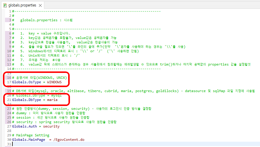 Globals.DbType = maria 로 DB타입을 지정했지만 Maria DB 와 MySQL 이 헷갈릴 수 있기 때문에 MySQL 설정부분을 '#' 으로 주석처리하기로 한다.
