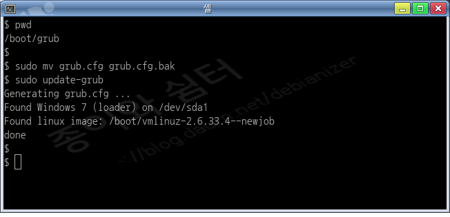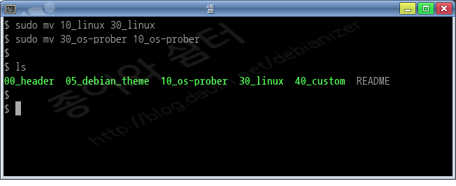 5. 마지막으로 `/usr/sbin/update-grub` 를 한번 더 실행시킨다. (/boot/grub/grub.cfg 를 직접 고치는 방법도 있음)