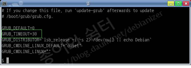 4. /etc/default/grub 을 열고 GRUB_TIMEOUT=30 을 GRUB_TIMEOUT=1 로 고친다.