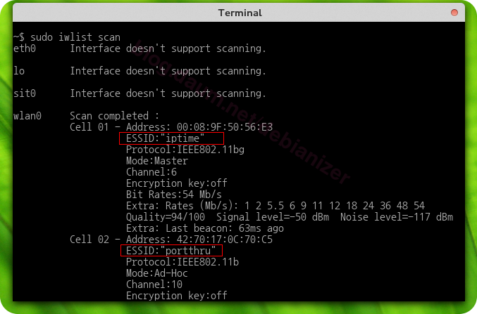 관리자 권한으로 `iwlist scan`을 실행하면 wlan0 인터페이스 아래에 접속가능한 AP (Access Point; 즉 WIFI 모뎀 정보) 목록이 출력된다.