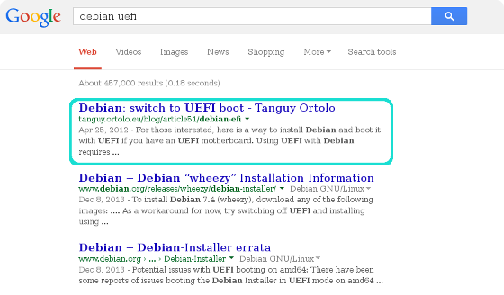 (키워드 'debian efi' 또는 'debian uefi' 로 검색하면 가장 먼저 뜨는 결과다! 구글 짱! 탕가이 아저씨도 짱!!)