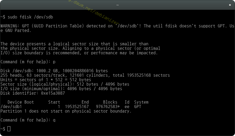 [ fdisk 로 파티션 접근을 시도하면 지원할 수 없으며 GNU Parted 를 사용하라고 알려 준다 ]