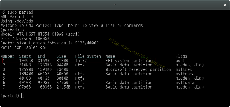 [ /dev/sda 에 위치한 윈도우즈 파티션 정보 -- GPT ]