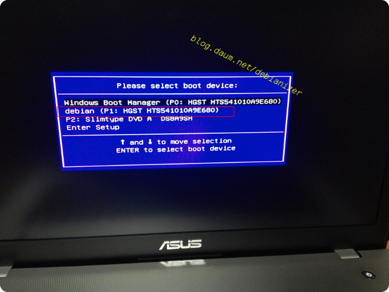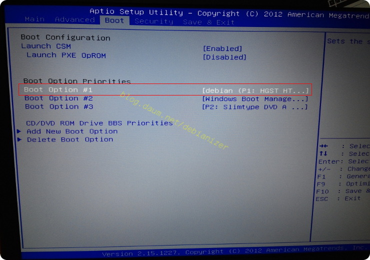 시스템 종료 후, 재부팅이 일어나기 전에 BIOS Setup 에 들어가면 debian 엔트리가 보일 것이다.