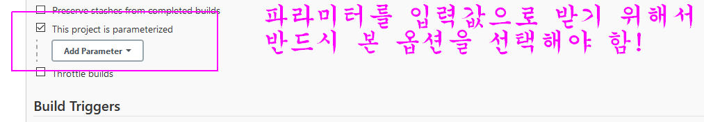 파라미터를 입력값으로 받는 Job 인 경우에는 "General" 섹션에서 다음을 체크하여야 한다.