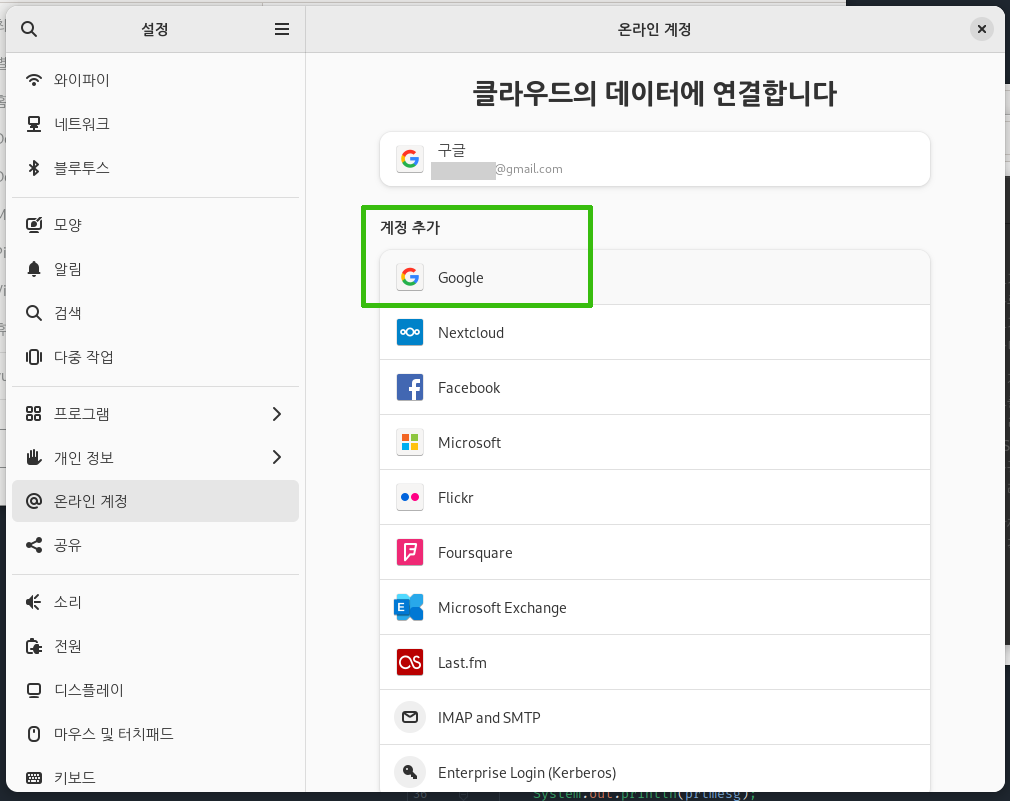 2) 그놈 제어판에서 [온라인 계정] 섹션을 선택하면 현재 그놈에서 지원하는 클라우드 제공자를 볼 수 있다.