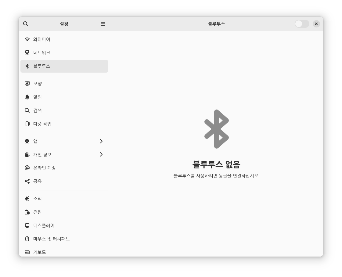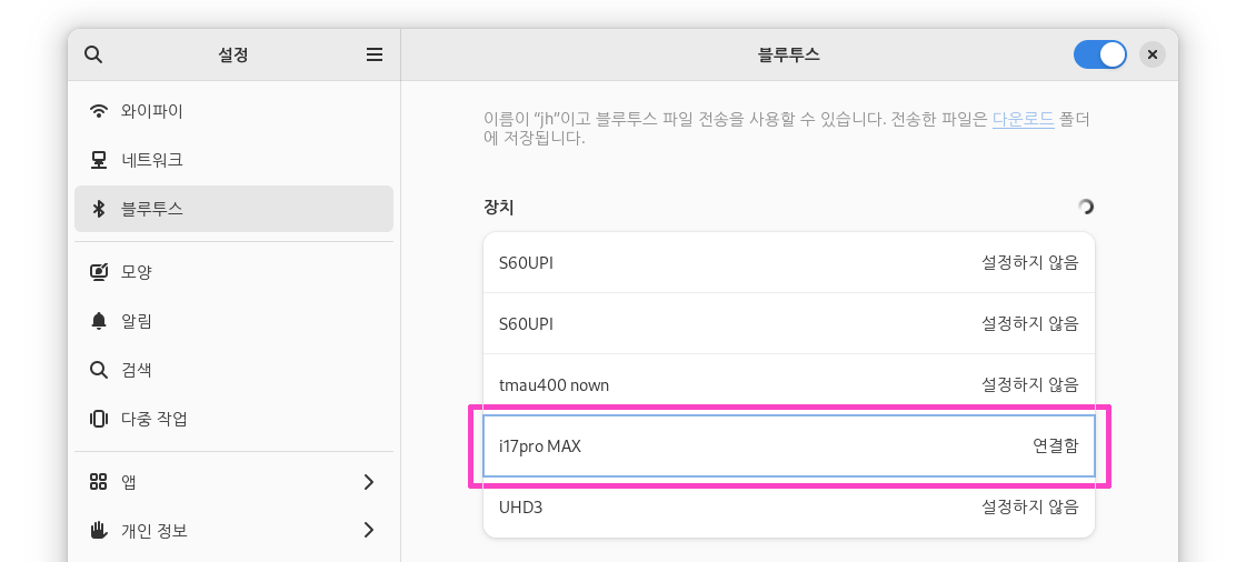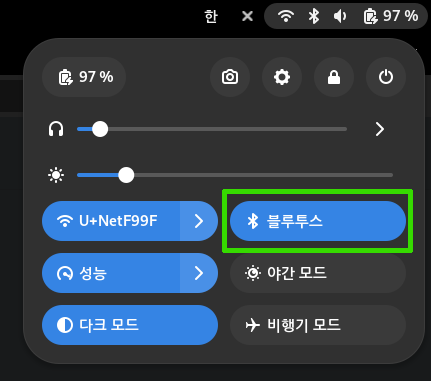 이 패키지를 설치하고 그놈을 재시작했더니 그놈 우측 상단 작업막대에 드디어 블루투스 항목이 생겼다.