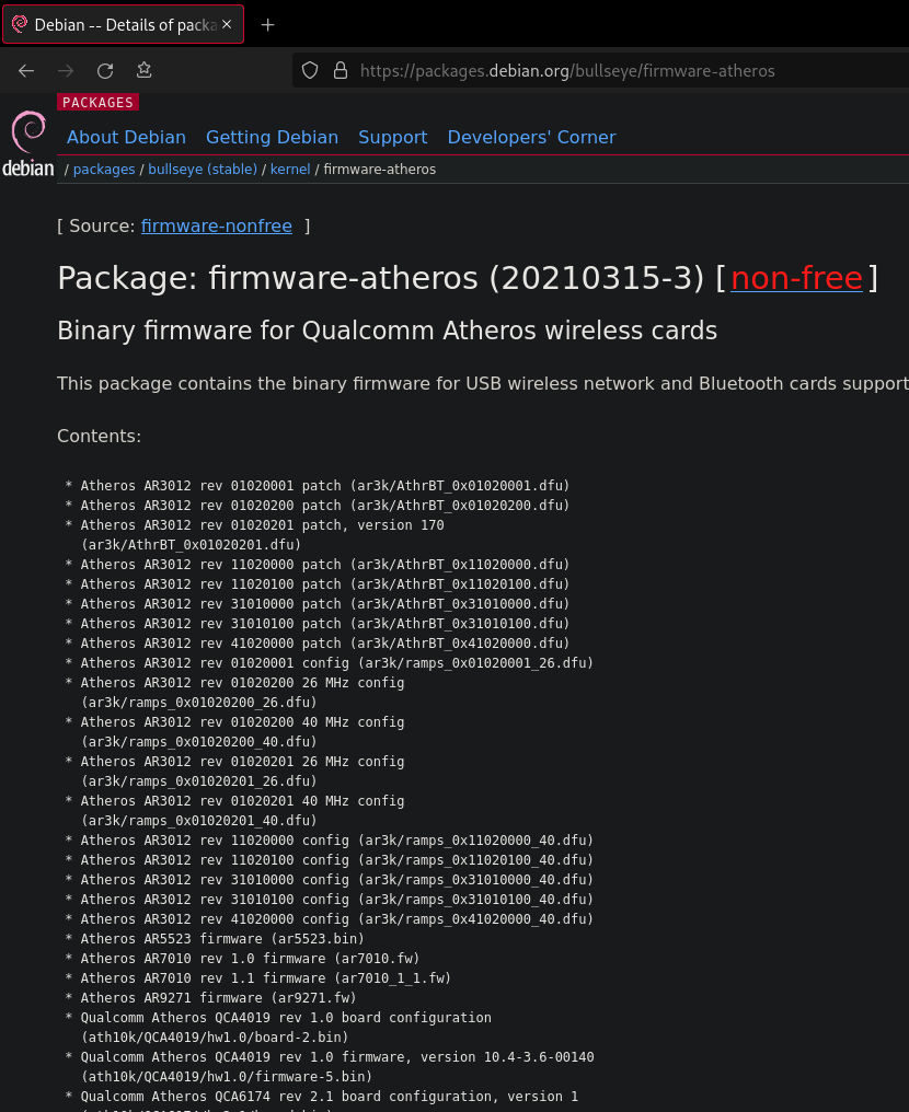 firmware-atheros 패키지는 이 글을 쓰는 시점에서, stable 버전인 코드명 bullseye 에서만 찾을 수 있다.