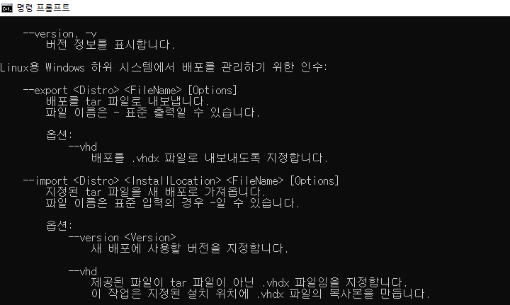 wsl.exe 는 윈도 cmd.exe 쉘에서 처리되는 유틸리티이다. 따라서 다음 명령들은 윈도 CMD 쉘에서 실행해야 한다.