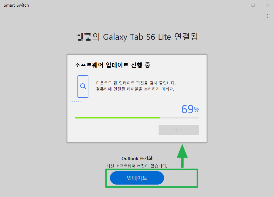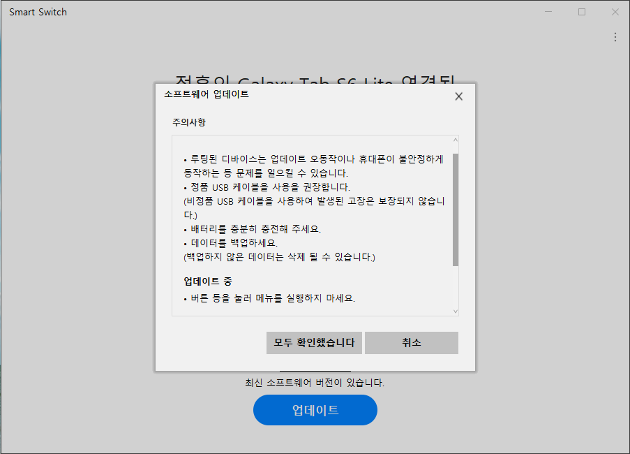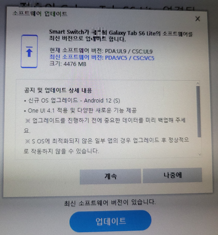 삼성 스마트스위치 앱을 윈도pc 에 설치한 후에 갤탭과 연결하면 앱 화면 하단에 갤탭 업데이트 버튼이 생기는데 이것을 눌러서 업데이트할 수 있다. x벌 드디어 찾았네!