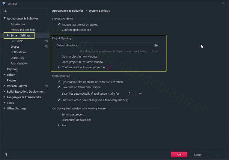 [File]-[Settings]-[Appearance & Behavior]-[System Settings]-[Project Opening] 에서