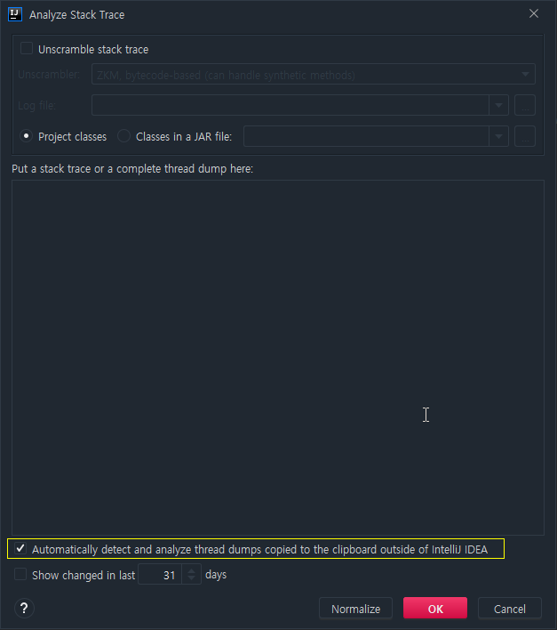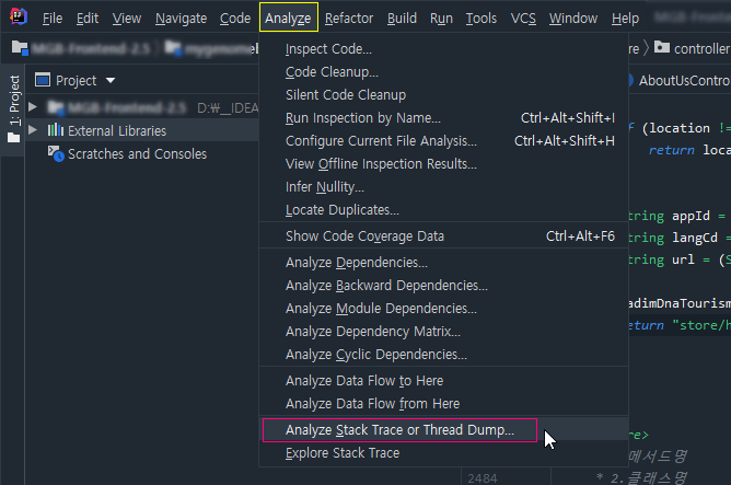 [Analyze]-[Analyze Stack Trace or Thread Dump]' 를 클릭한다.