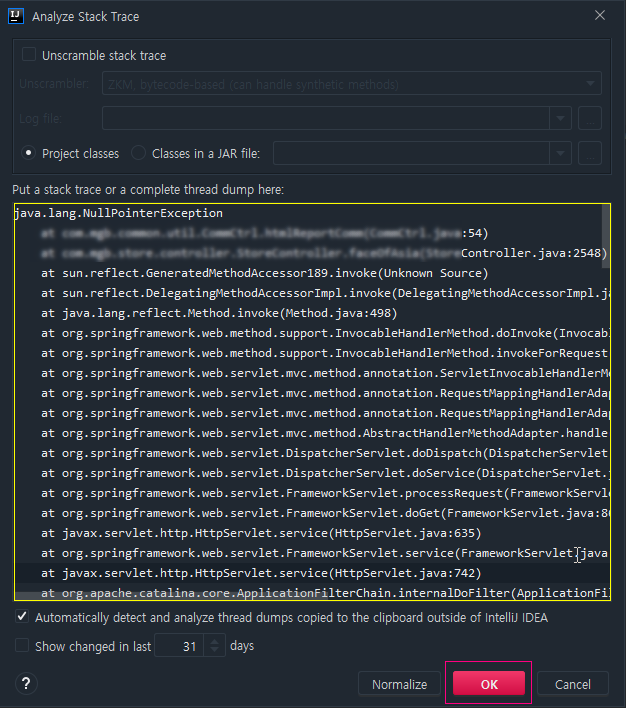 3. 맨 아래에 복사해온 Stack Trace 메시지들을 붙여넣는다. 알아서 클립보드에 복사된 오류를 긁어오기도 한다.