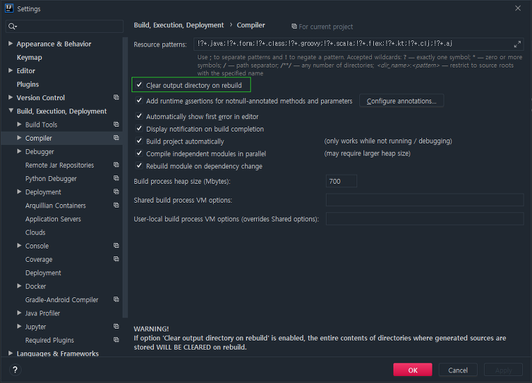 [File]-[Settings] 에서 [Build, Execution, Deployment]-[Compiler]-[Clear output directory on rebuild] 를 체크하면 된다.
