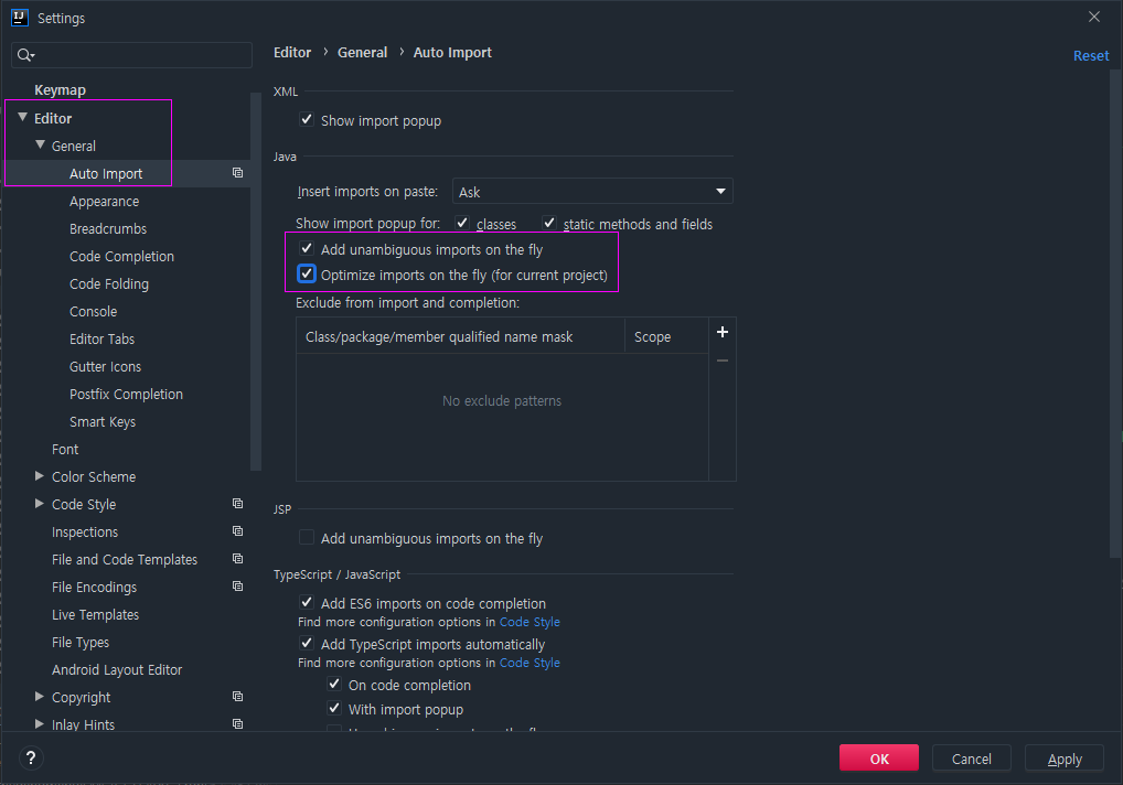 Editor > General > Auto Import 에서
