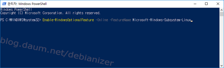 0. [준비] 파워쉘을 관리자 권한으로 실행하고 다음 명령으로 WSL 을 활성화한다.