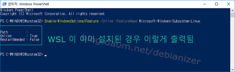 (WSL 을 기존에 설치한 적이 있다면 다음과 같이 출력됨)